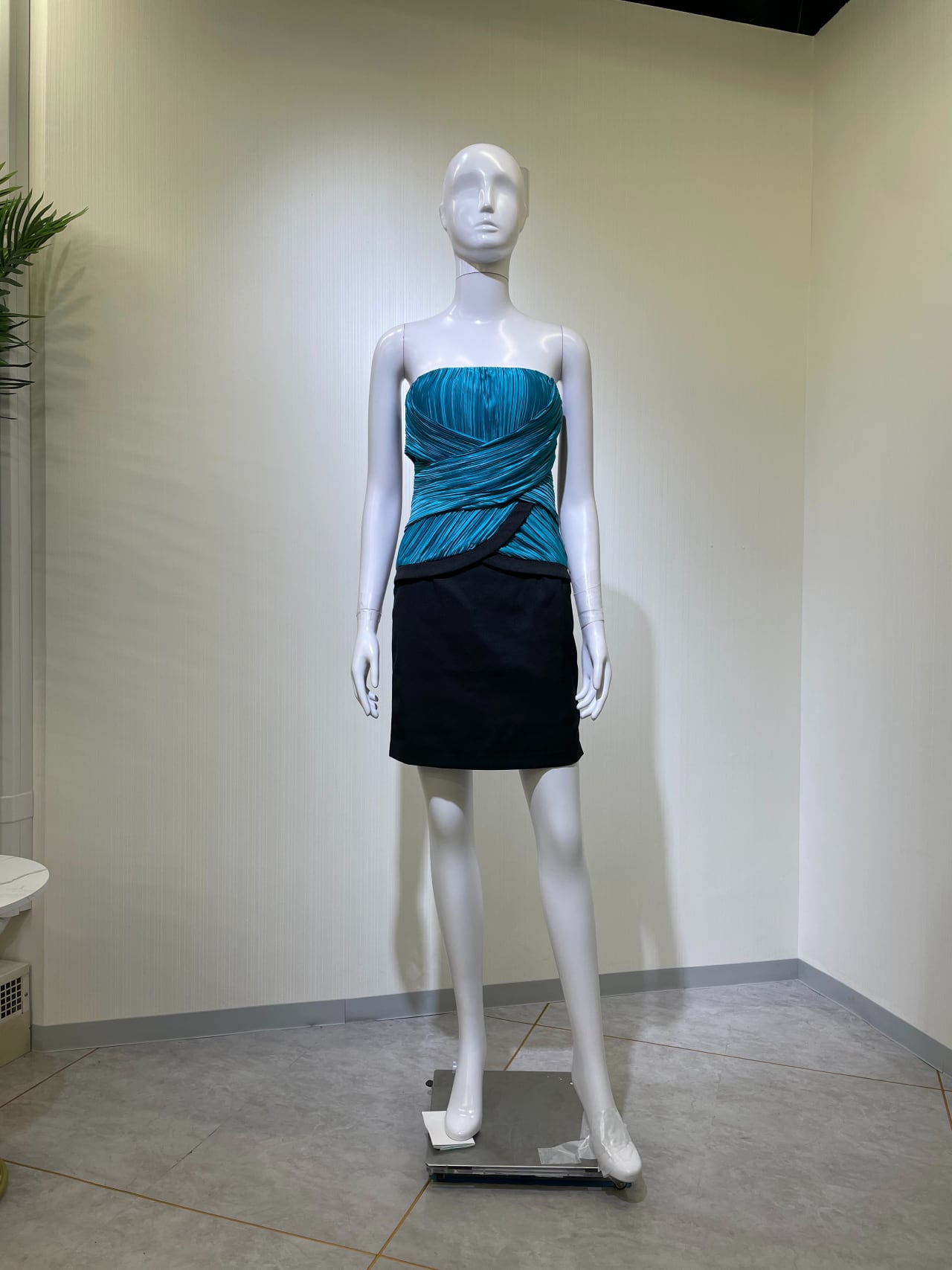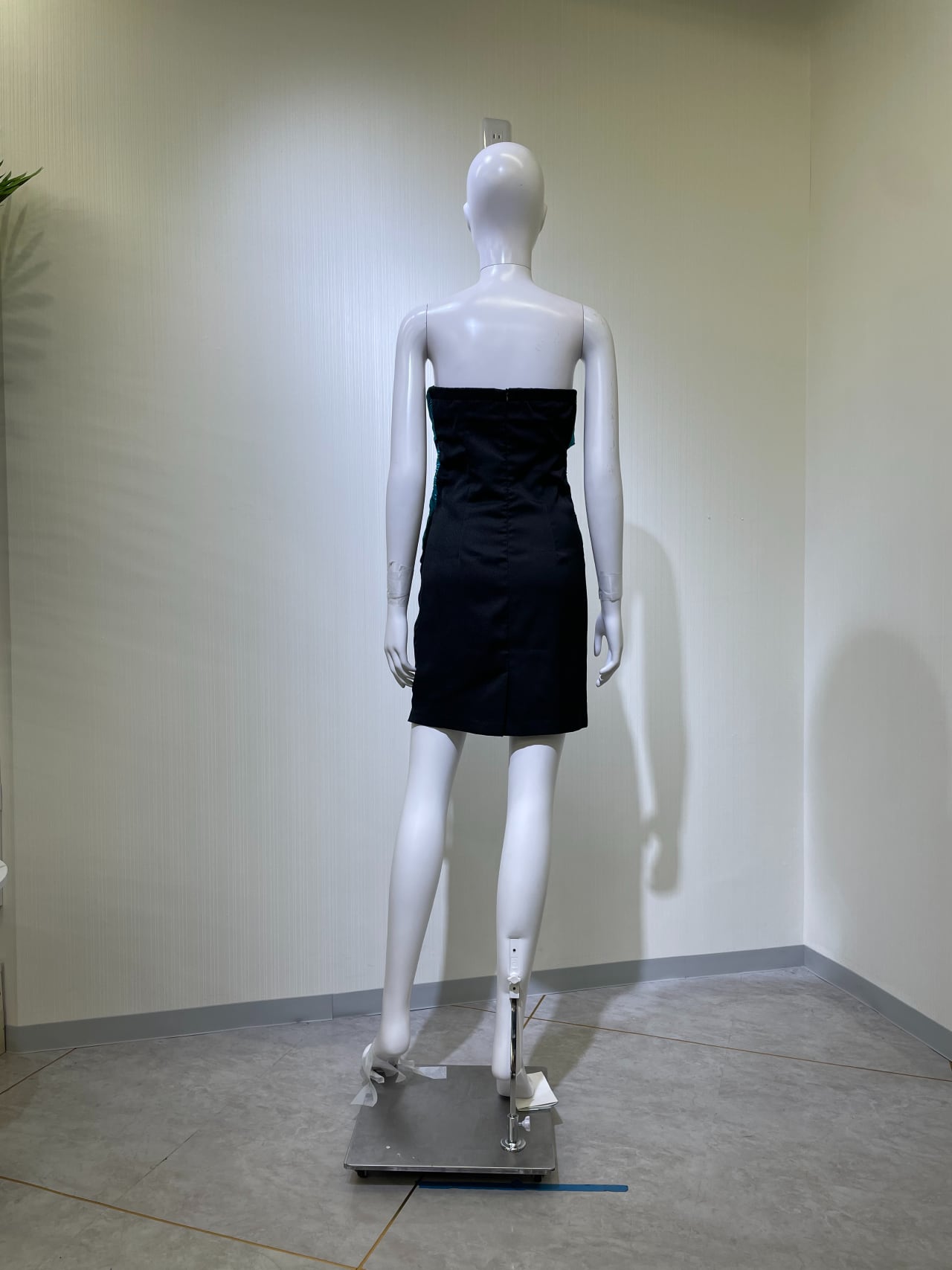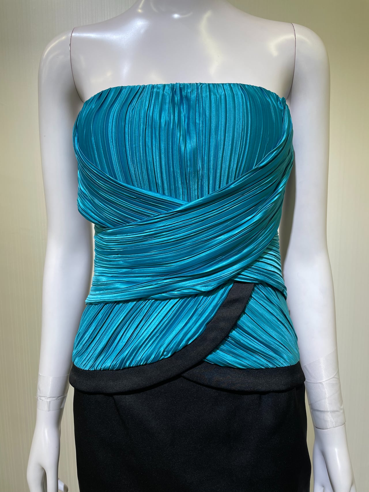 背中ファスナー、後中心スリット10cm、前グリーン部分生地キズ