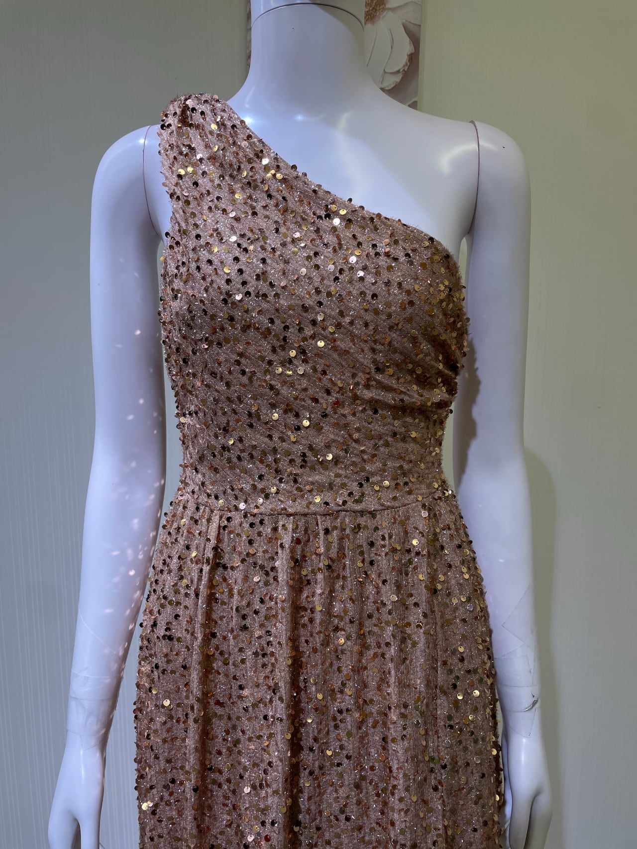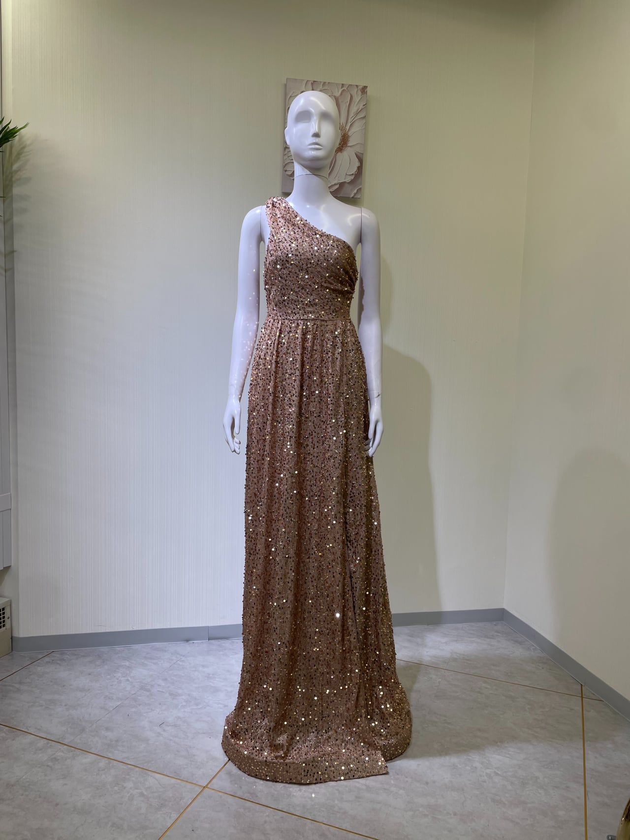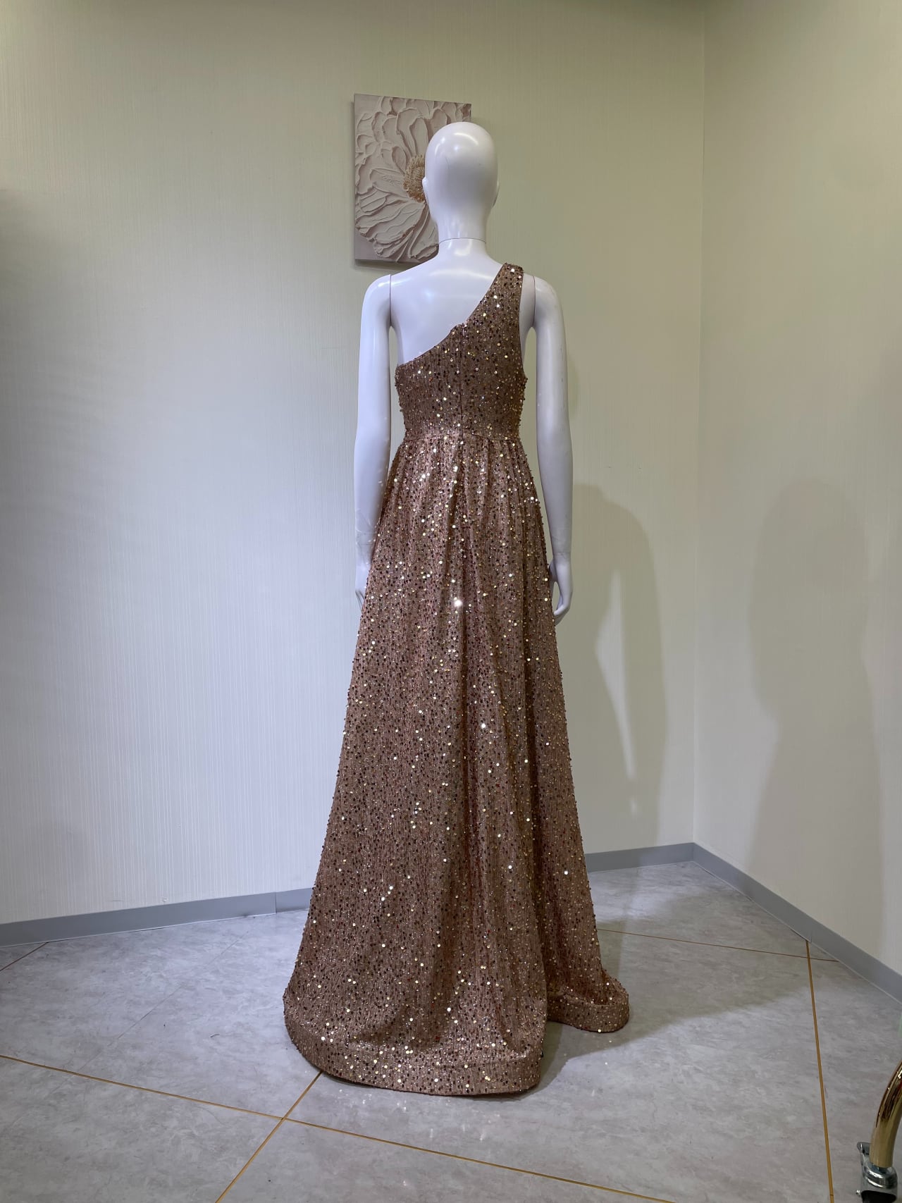 着丈右肩〜裾まで、後ろファスナー、左前スリット75cm