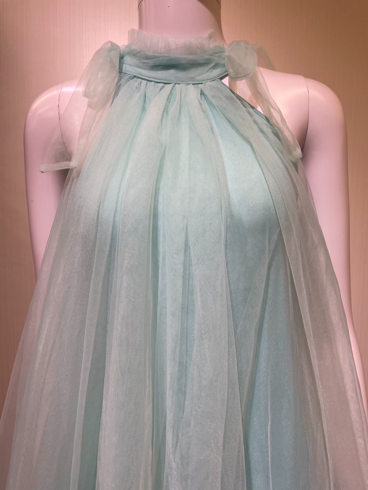 右肩リボン結び、左肩固定リボン、左脇ファスナー