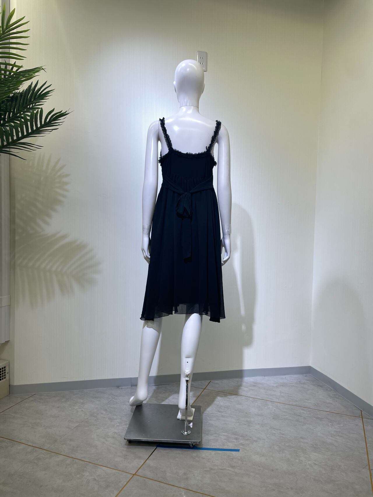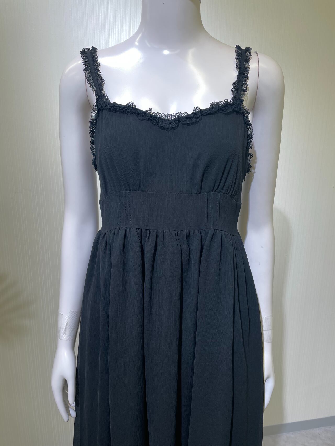 着丈肩ひも調整不可、左脇ファスナー、ウエストサイドリボンを後ろで結ぶ、レース使用感