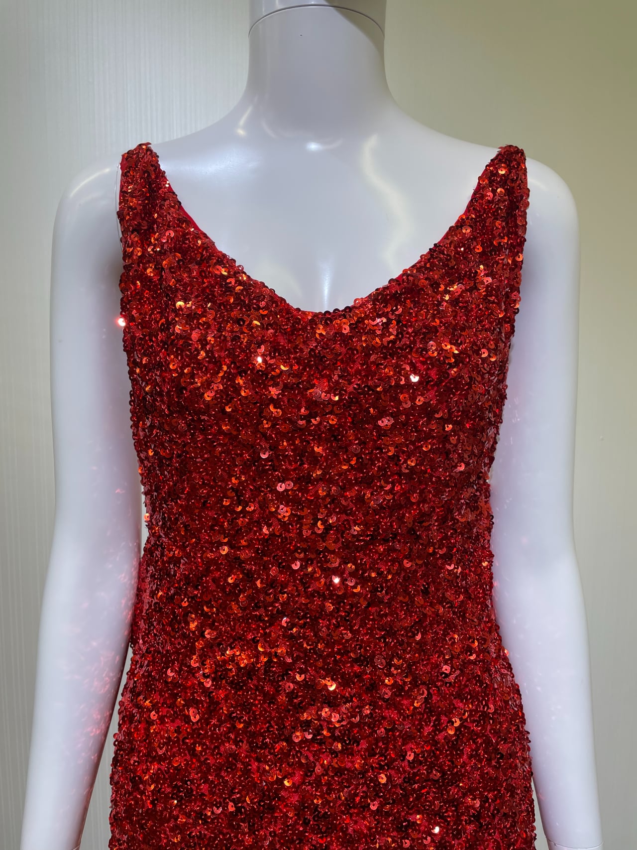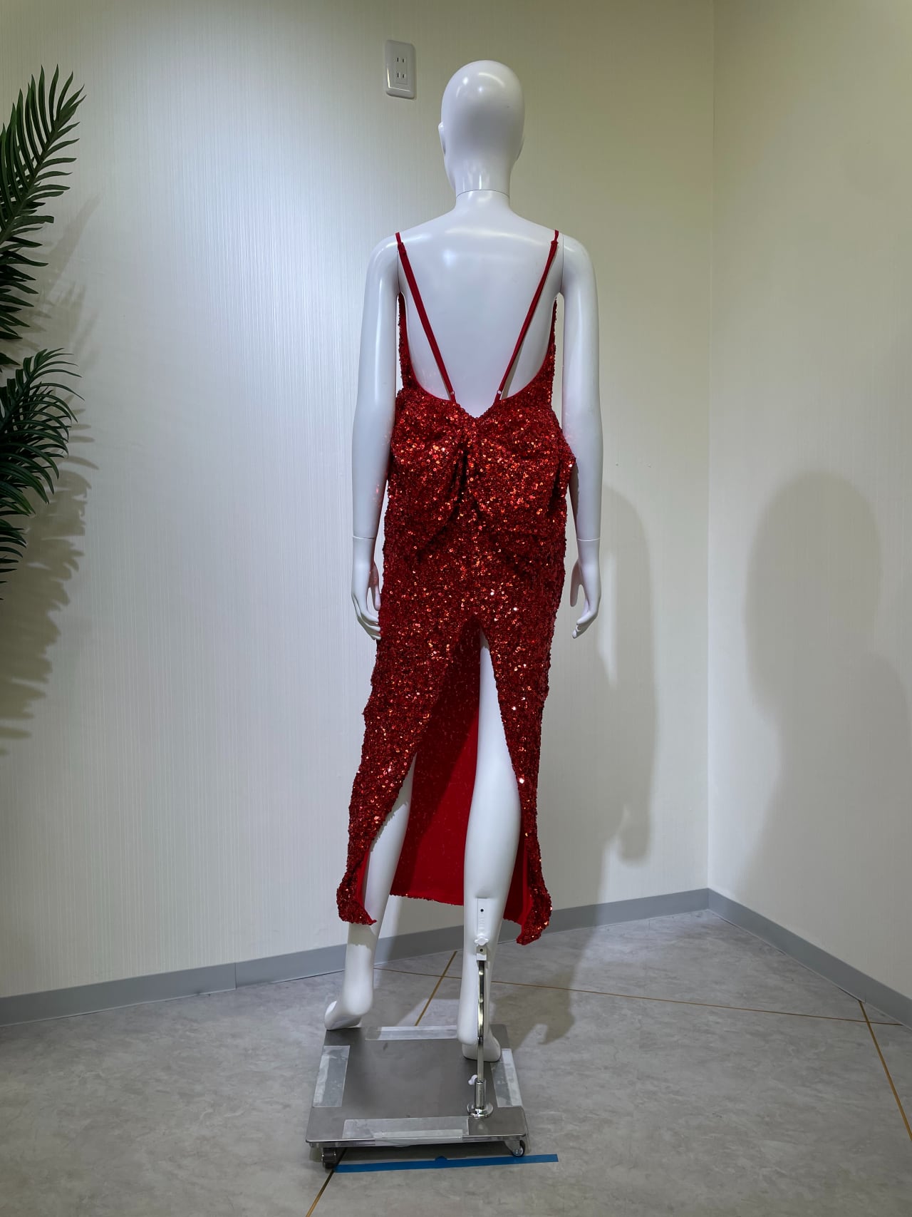 着丈前中心から113cm、スパンコール伸びる、後ろ中心スリット60cm、腰リボン取り外し不可、使用感