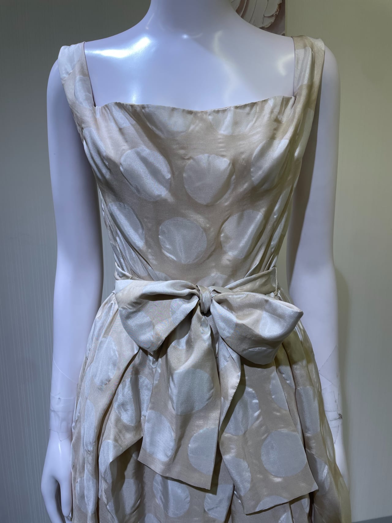 背中ファスナー、右前長い、ウエストリボンベルト有り、ベルト通し有り
