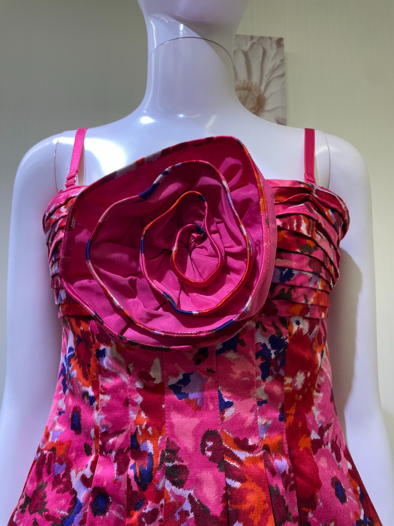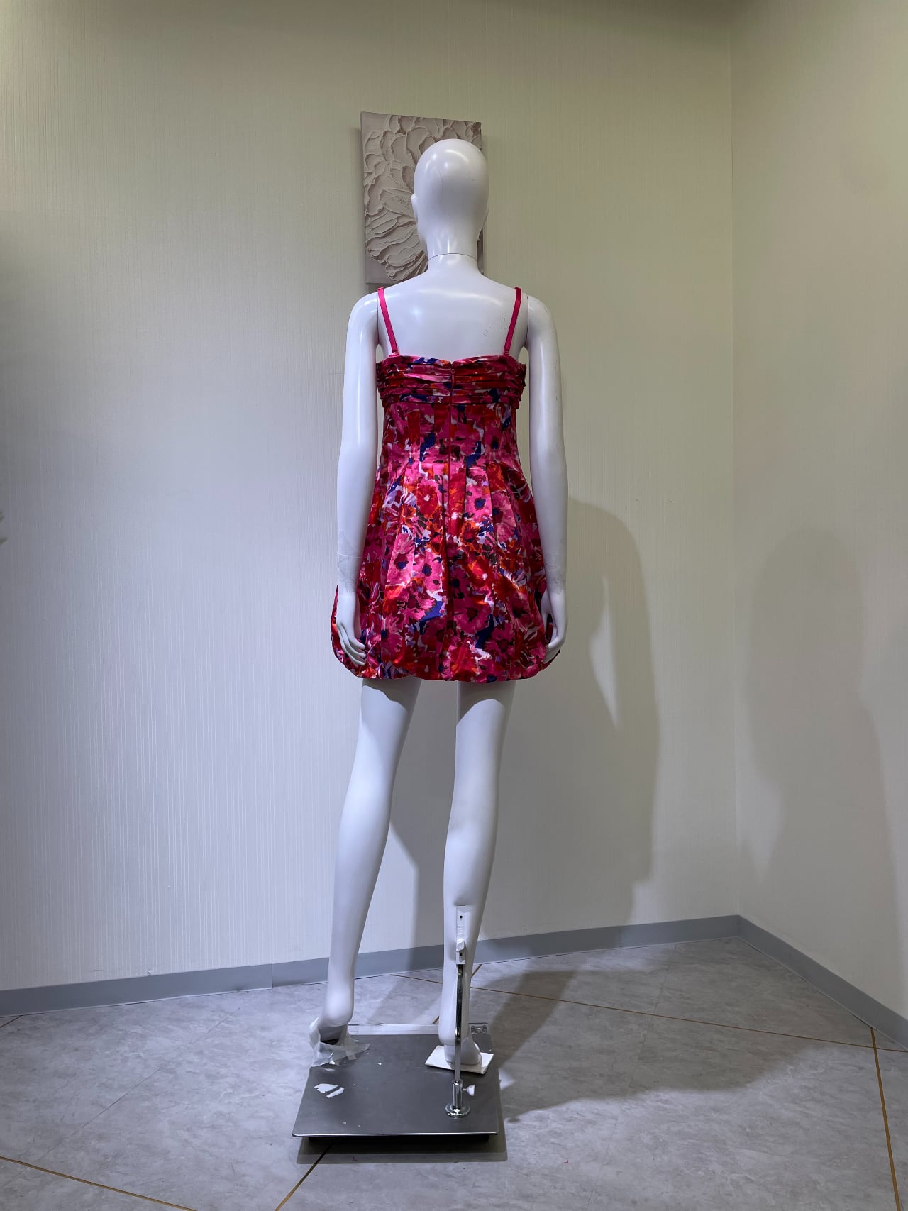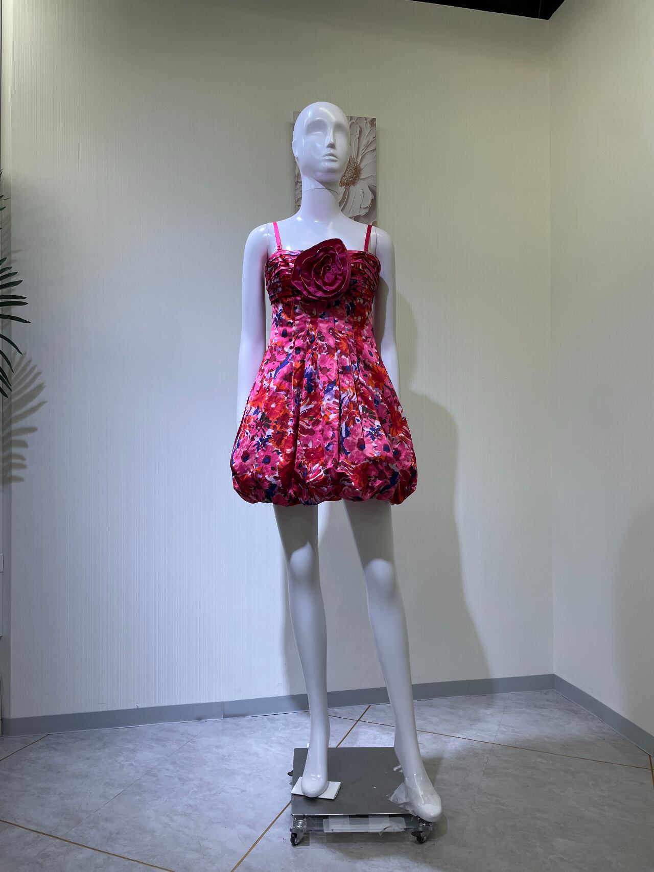 背中ファスナー、胸の花取り外し不可、肩ひも調整可能、バルーンヘム裾